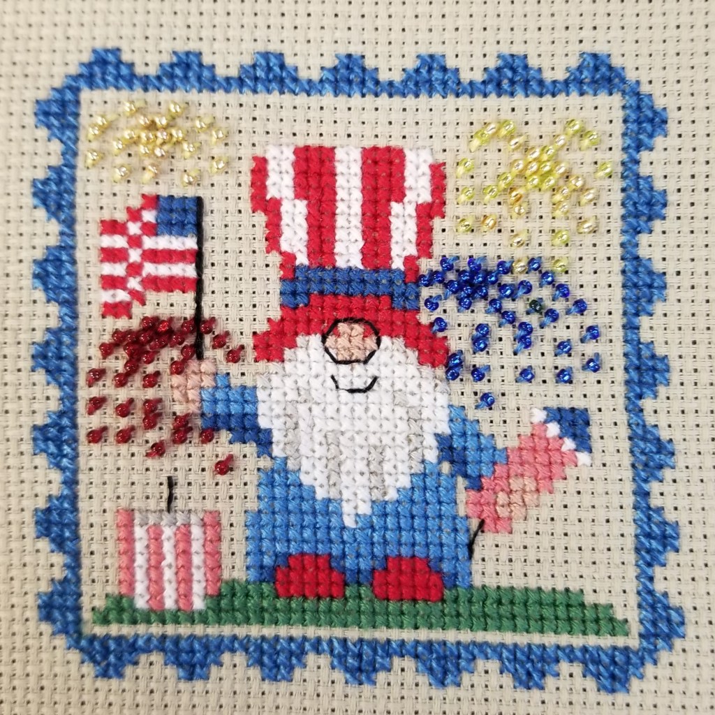 Oh, and before I end off, I want to share a picture of one of my Patriotic Gnome Trio designs, stitched by a local stitcher Kim Baldwin. She used the DMC alternates and substituted seed beads for thread on the fireworks. What a great idea that was! It really adds a nice “POP” to the piece! Great job, Kim! 🙂