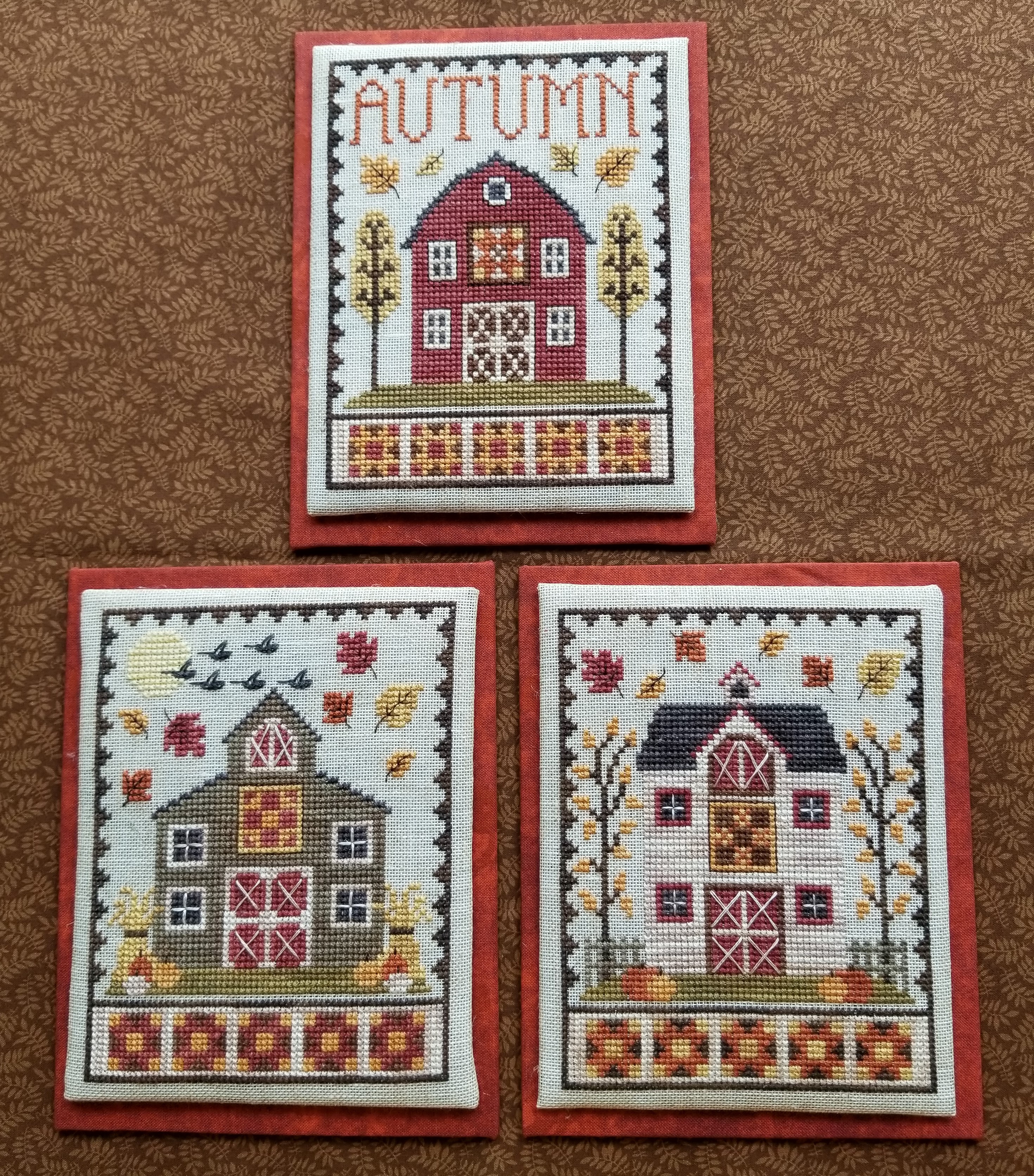 Summer is finally here, but I’ve been busy designing and stitching for fall, and here is what I came up with: #219 – AUTUMN BARN TRIO. This set, like all the other popular Trio sets, contains 3 quick-to-stitch designs with a seasonal theme. A couple of years ago, I did a Patriotic Barn Trio set, and since then I’ve received requests for more of these cute little barns. All of these barns are set in an autumn scene and each is decorated with a barn quilt design in fall colors. If you like country or Americana style, these little designs might be just what you’re looking to stitch!