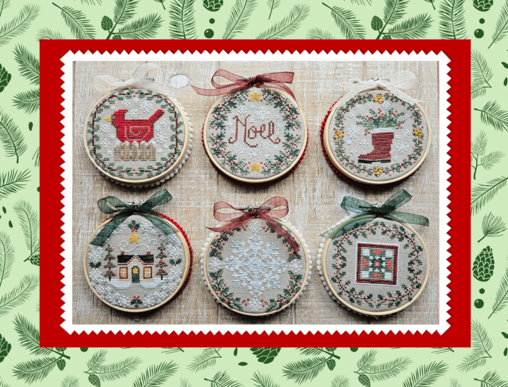 Hope you all are enjoying this lovely Autumn season and are ready to start some projects for Christmas! This set of 6 quick-to-stitch designs will make it easy for you to work up some festive cross stitch projects with time to spare! Each design is 4″ x 4″ and can be finished easily in a 4″ wooden embroidery hoop and a little ribbon & trim.